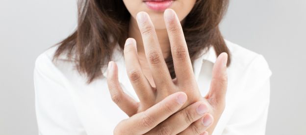 Con la parte più alta del polpastrello del pollice della sinistra premete la parte tra il palmo e il pollice all'altezza del legamento.