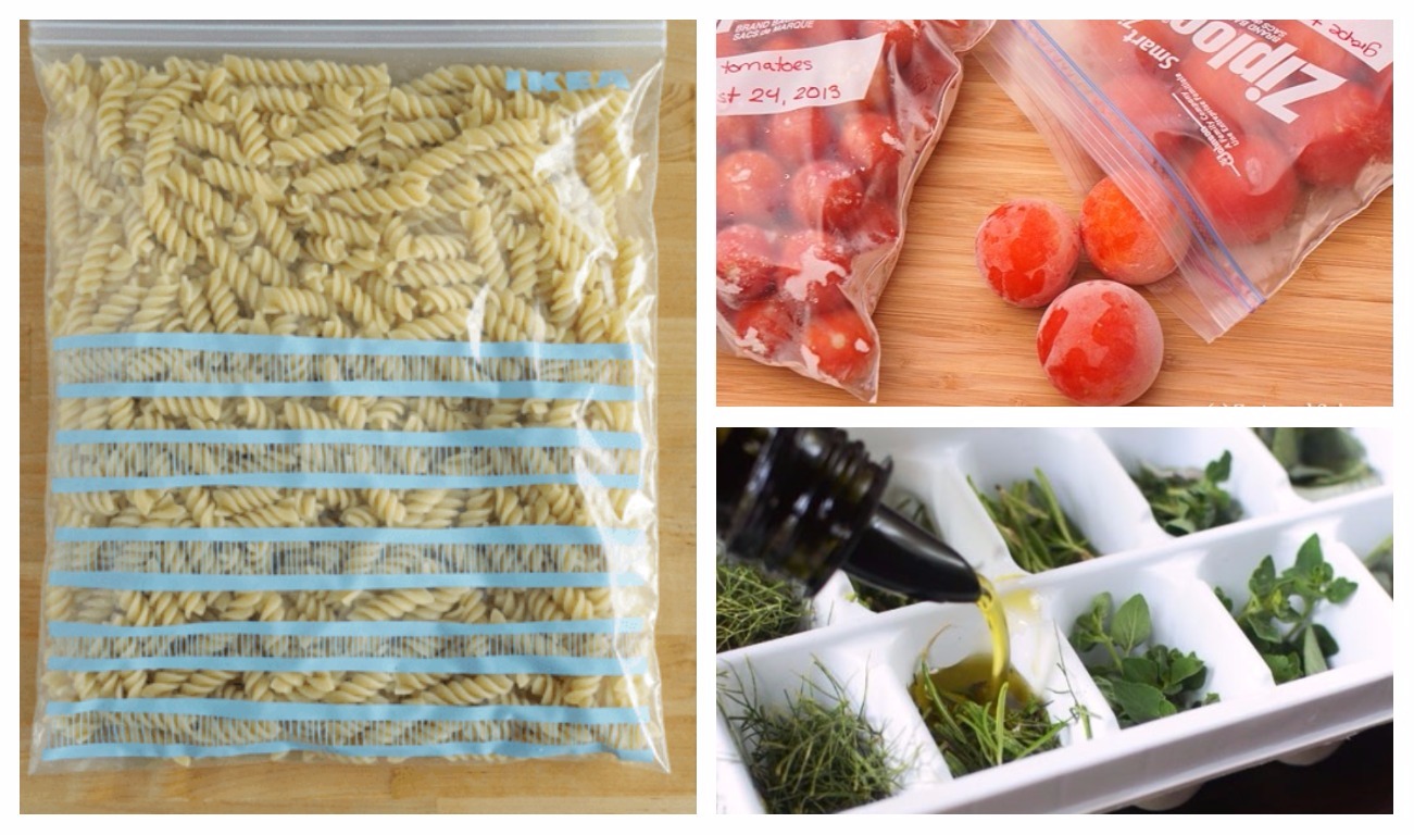 Dadi, cipolle, peperoncini o zucchine, basta tagliarli a fettine, metterli in dei sacchetti di plastica e poi riporli in frigo. Per scongelarli, bastano poche ore a temperatura ambiente. Pomodori roma arrostiti nel forno a bassa temperatura (225 gradi o giù di lì) con aglio, erbe fresche e una pioggerellina di olio d'oliva per 4-5 ore. Quando raffreddato, trasferire i pomodori in sacchetti freezer. Usalo in peperoncino o per fare salse di pomodoro. Congela le erbe fresche nelle formine per fare i cubetti di ghiaccio. saranno perfetti per zuppe, stufati o insaporire altri piatti, o anche per degli smoothie freschissimi.