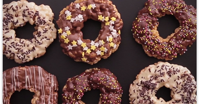 Queste irresistibili ciambelline glassate al cioccolato sono preparate con riso soffiato e marshmallows: una versione alternativa alle classiche ciambelle donuts fritte.