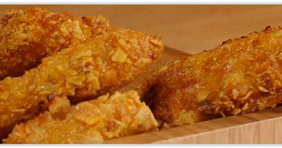 Mettere i cornflakes in una ciotola e tritarli grossolanamente con un pestello di legno. Tagliate il pollo a pezzi abbastanza grossi.
