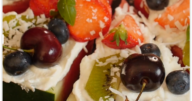 Tagliare a fette l'anguria, quindi spalmare con lo yogurt di capra e decorare con la frutta fresca a fettine.