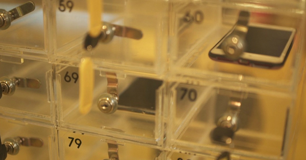 La speciale scaffalatura che è stata installata all'ingresso è stata progettata per contenere 100 smartphone.