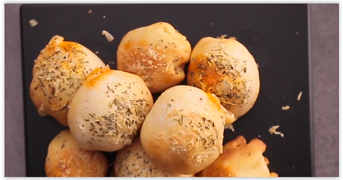Stendere la pasta da pizza. Ricavare dei cerchi di pasta con uno stampino da biscotti. Stendere un cucchiaio di passata di pomodoro, poi una fettina di salamino ed una mozzarellina su ogni cerchio di pasta. Richiudere la pasta premendo delicatamente sui bordi, poi arrotolare con i palmi delle mani e distribuire sulla placca del forno ricoperta di carta forno. Mescolare il burro fuso, l'aglio, il sale, il pepe e le erbe in una ciotola, e usarlo per spennellare le palline di pizza con un pennello. Spolverare generosamente con il Parmigiano grattugiato. Infornare a 200° per 10 minuti circa, fino a che le palline di pizza saranno dorate.