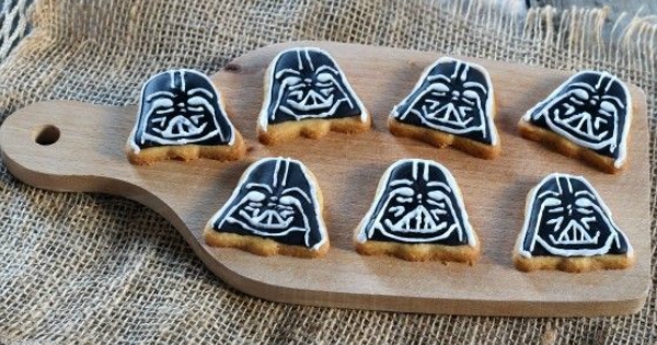 Realizzate il viso di Dark Vador aiutandovi con un modellino. Aiutatevi con uno stuzzicadenti per stendere eventualmente la glassa.