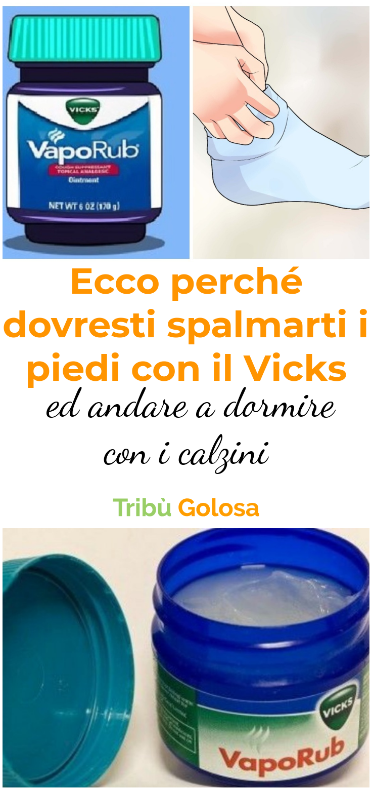 I piedi sono ricchi di terminazioni nervose e di capillari, che se trattati con il Vicks alleviano alcuni disturbi e dolori . Sapevi che mettere il Vicks sui piedi prima di andare a dormire, coprendo con i calzini, ha degli effetti super benefici sulla salute?