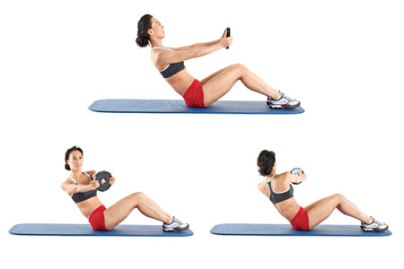 Siedit sul pavimento, afferra il peso mantenendo le braccia dritte e forma un angolo di 45° con la schiena e le gambe. A questo punto ruota sul fianco destro più a fondo che puoi, poi lentamente ruota sul fianco sinistro. Ripeti per 10 volte (5 per lato) e riposa 60 secondi. Ripeti altre 2 serie.