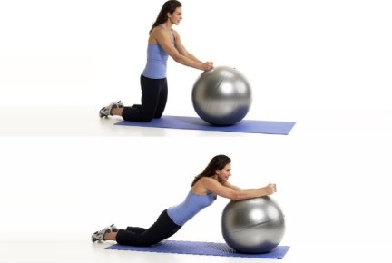 Posizionatela in fronte a voi ed inginocchiatevi, a questo punto appoggiate i gomiti sulla palla e ruotate in avanti fino a stendere la schiena.