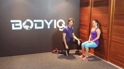 Appoggiandovi al muro mantenete la posizione per 30 secondi, poi recuperate altri 30 secondi.