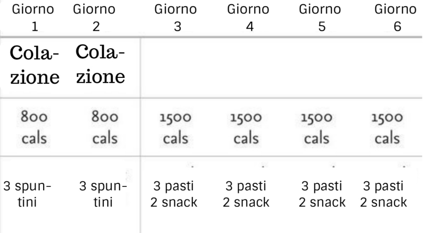 Durante i primi tre giorni della dieta si consumano solo centrifugati verdi e un solo pasto solido al giorno, nei quattro successivi si fa un pasto in più passando da 1.000 calorie a 1.500. Questa forte riduzione delle calorie induce una perdita di peso pressoché immediata, che poi viene mantenuta della seconda fase della dieta, che dura anch'essa due settimane.