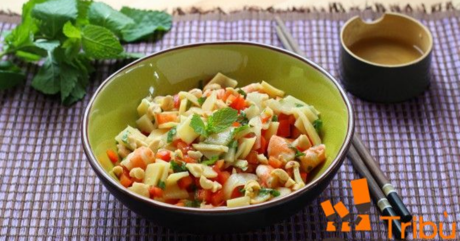 Sgusciate i gamberetti e lavateli per bene.Tagliate i gamberetti in tre. Tagliate il peperone, togliete i filamenti, i semi e le nervature, poi tagliatelo a pezzetti. Risciacquate e sgocciolate i germogli di soia, poi tagliateli a pezzetti. Preparate la salsa mescolando tutti gli ingredienti in una ciotolina. Preparate la salsa mescolando tutti gli ingredienti in una ciotolina. Rompete gli anacardi tritandoli grossolanamente con un coltello. Prendete una ciotola e mescolate i gamberetti, il peperone e i germogli di bambù. Aggiungete la salsa e mescolate. Spezzettate la menta ed aggiungetela all'insalata.Servite l'insalata in ciotole individuali spolverando con gli anacardi.