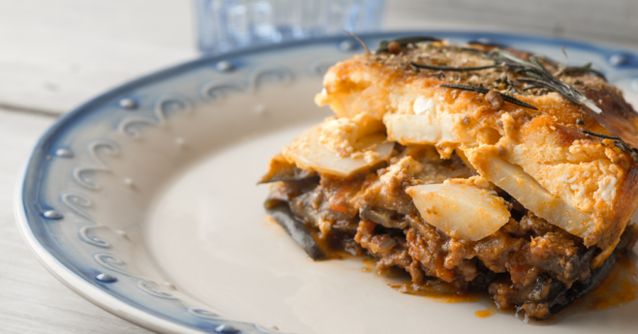 La moussaka greca è un piatto della tradizione che si avvicina alla lasagna ed alla parmigiana. In cosa si differenzia? Nella moussaka non c'è la presenza di lasagne; questo delizioso piatto unico è invece composto da melanzane, ragù di agnello, besciamella e patate a fettine sottili.