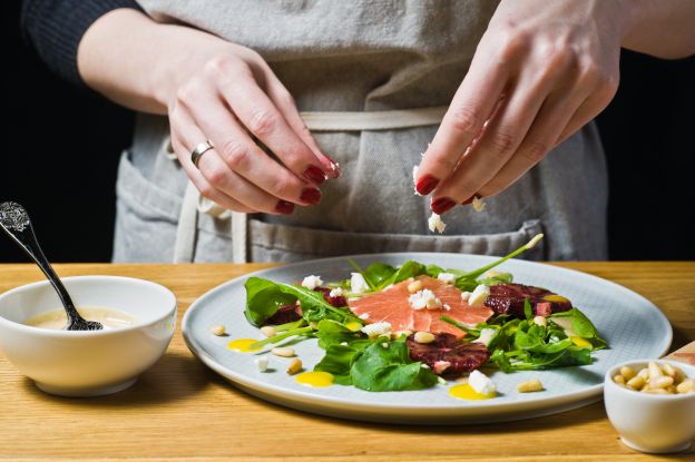 Spolverate con la feta sbriciolata. Unite un po' di pinoli.