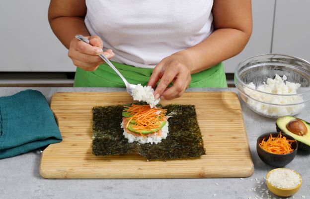 Termina con un altro strato di riso per sushi (da 2 a 3 cucchiai circa) e premi delicatamente il ripieno con le mani.