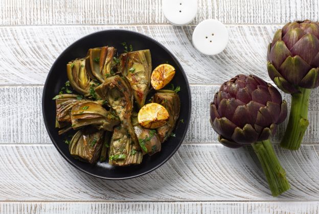 Togliere le foglie più esterne dei carciofi, tagliarli a metà ed eliminare la peluria, poi tuffarli in una ciotola con acqua acidulata con succo di limone. Scaldare bene la piastra e versare un filo d'olio. Far cuocere i carciofi per 5 minuti dal lato interno e per 15 minuti circa dal lato esterno. Quando i carciofi saranno cotti, eliminate le foglie bruciacchiate più esterne, condite con un po' d'olio, spolverate con aglio e prezzemolo tritati e cospargete di pepe.