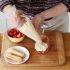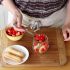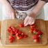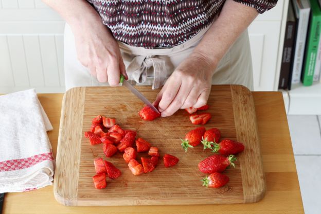 Mettere da parte due fragole per la decorazione e tagliare a dadini la frutta rimanente.