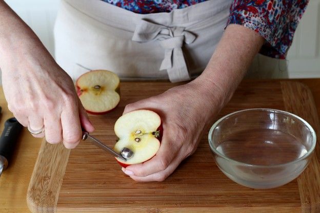 Versare un p'o d'acqua in una ciotola e aggiungervi il succo del limone spremuto. Tagliare le mele a metà, poi con un cucchiaio tondo prelevare delle biglie di polpa di mela.