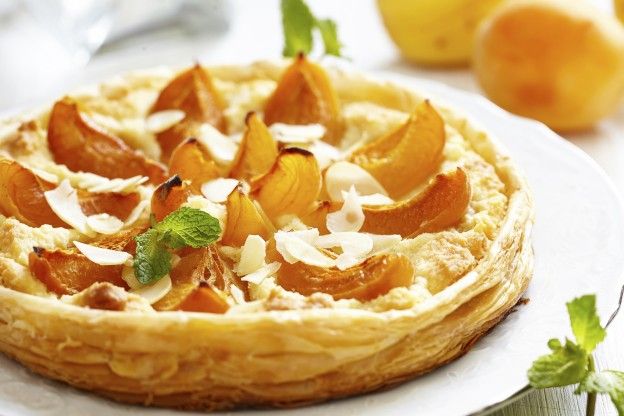 Acquistate un rotolo di pasta sfoglia, stendetelo in una tortiera di 24-26 cm di diametro e farcitela con una crema alle mandorle preparata con uova, farina di mandorle e zucchero.Decorare la crostata con delle albicocche tagliate in quarti. Dopo la cottura in forno, cospargete di mandorle a filetti. Una vera delizia!