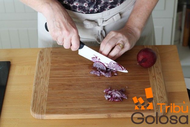 Pelate e tritate abbastanza finemente la cipolla rossa. Mettetene da parte 2 cucchiai.