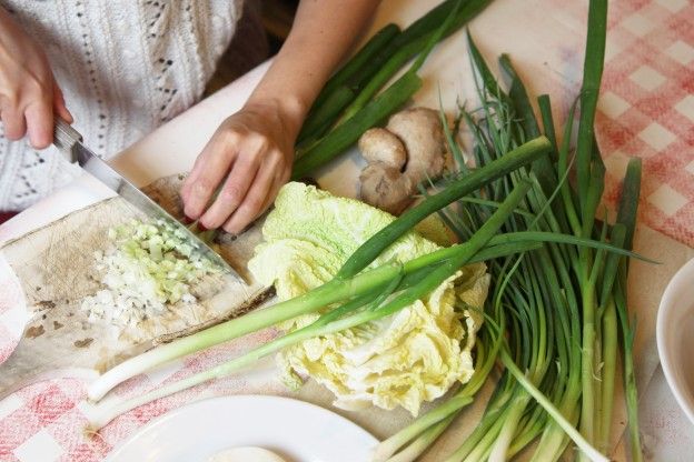 Tritate l'erba cipollina, le foglie di cavolo e lo zenzero.