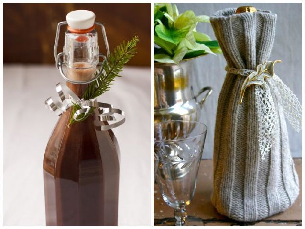 Potete offrirlo ai vostri cari semplicemente decorandolo con un nastrino dorato e un rametto di pino, ma se volete qualcosa di più particolare usate la manica di un vecchio maglione! Vi basterà farvi passare attraverso la vostra bottiglia, chiuderla sul fondo e decorarla con un bel fiocco: avrete cosi una confezione elegante e super originale!