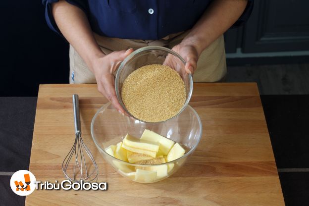 Versate il burro a temperatura ambiente in una ciotola, unite lo zucchero di canna e mescolate bene.