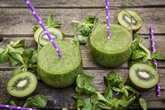 Mixate insieme 1 banana, 1 kiwi, 90 gr d'insalata valeriana in latte d'avena o latte di cocco.