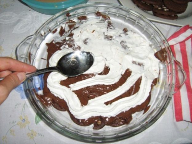 Mettete a riposare in frigorifero per 1 ora. Capovolgete la torta e terminate decorando con la crema al cioccolato fondente rimasta e con un po' di cioccolato bianco.
