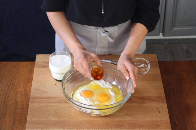 Mescolate la farina, lo zucchero e il sale in una ciotola. Praticate un buco al centro, incorporate le uova ed il rum, quindi mescolate piano. Mescolate il burro fuso al latte e versate l'impasto nella ciotola mescolando energicamente.