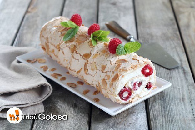 Preriscaldate il forno a 180°, poi tappezzate uno stampo rettangolare di 30 cmx x 20 cm con della carta forno. Montate gli albumi a neve e versate lo zucchero a velo gradatamente fino ad ottenere una consistenza ferma. Aggiungete delicatamente l'aceto, la vaniglia e la Maizena alla preparazione.Versate l'impasto nello stampo ricoperto di carta forno. Spalmatelo con l'aiuto di una spatola e lisciate bene la superficie. Spolverate con mandorle a filetti. Infornate e fate cuocere per circa 15 minuti. Una volta tirato fuori dal forno, lasciate raffreddare per 5 minuti prima di sformare. Montate la panna ben fredda con il mascarpone e lo zucchero a velo.Spalmate la meringa con la panna montata.Cospargete i lamponi sopra la crema.Arrotolate delicatamente la torta.Terminate senza stringere troppo e disponete il rotolo su un piatto rettangolare. Spolverate di zucchero a velo, decorate la superficie con qualche lampone e foglia di menta fresca. Mettete il rotolo in frigorifero per almeno 1 ora prima di degustare