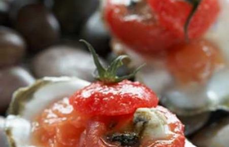 Pomodori ripieni di ostriche in gelatina all'acqua di pomodori e kiwi