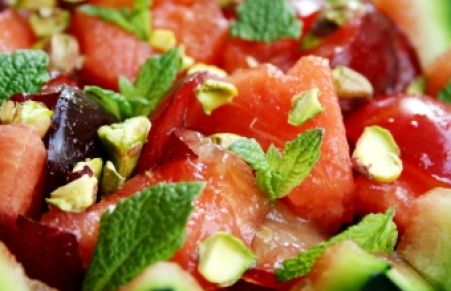 Macedonia di anguria, prugne, pistacchi e foglie di menta
