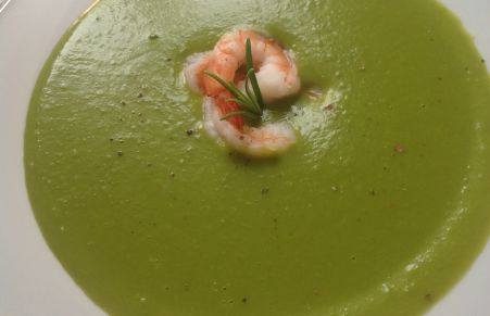Vellutata di piselli con gamberetti e crostini alle erbe