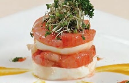 Lasagnetta di bufala campana e crudo di gamberi su salsa di fiori di zucca