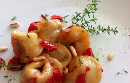 Tortelloni ripieni di melanzana di rotonda affumicata e Triglia saltati al burro di bufala e Pinoli