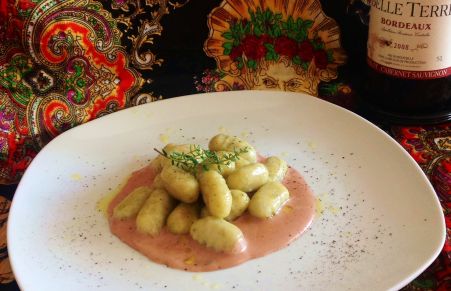 Gnocchi di Patate Rosse e Melanzane su fonduta di Camembert al Bordeaux