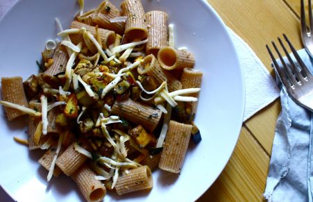 Rigatoni integrali ai due formaggi con melanzane grigliate