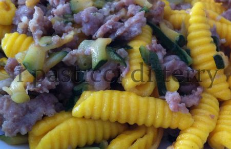 Una pasta fatta in casa, con aggiunta di zafferano nell'impasto. Condita con salsiccia e zucchine, direi un piatto unico. con una bella insalata e un frutto, un pasto completo. Trovi qui tutte le foto che abbiamo ricevuto per questa ricetta di Malloreddu giganti con salsiccia e zucchine.