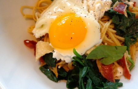 Spaghetti integrali con pancetta, spinaci e uovo fritto
