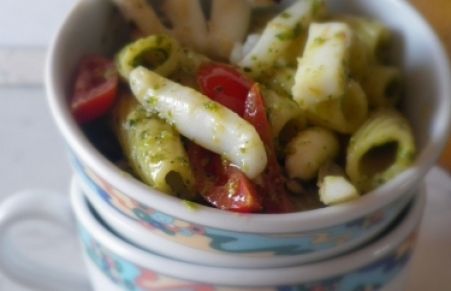 Pasta con pesto, pomodori e seppie grigliate