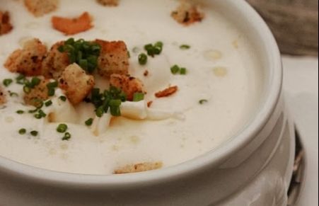 Alm-Graukäse Cremesuppe mit Knoblauch Croutons