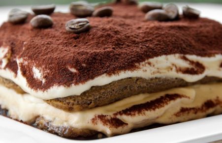 Tiramisù con panna e chicchi di caffè ricoperti di cioccolato