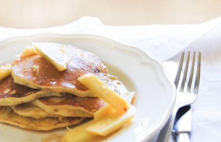 Pancakes al cocco con pesca e sciroppo di lime