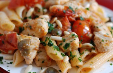 Pasta con pesce bandiera, peperoncini verdi e pinoli