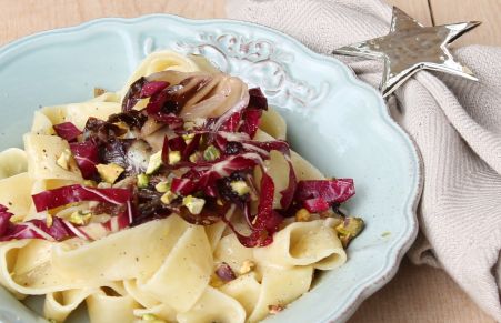 Una ricetta autunnale con il radicchio, formaggio Taleggio e pistacchi, per accompagnare pasta di grano duro, ruvida e porosa, gustosissima. Trovi qui tutte le foto che abbiamo ricevuto per questa ricetta di Pappardelle con taleggio, radicchio e pistacchi.