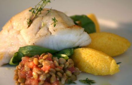 Filetto di lucioperca profumato al timo con lenticchie brasate e gallette di farina di mais