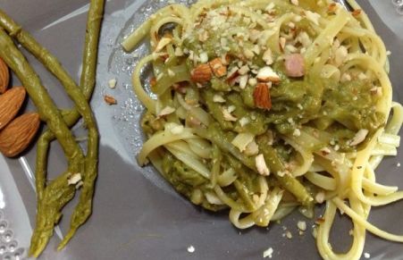 Linguine con asparagi, guanciale e mandorle