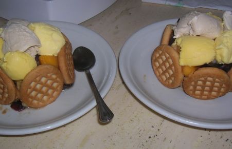 una merenda macedonia di frutta mista con sopra gelato e un goccio di mirto fatto in casa.. e biscotti attorno ..oppure senza ... Trovi qui tutte le foto che abbiamo ricevuto per questa ricetta di DESSERT CON MACEDONIA DI FRUTTA MISTA E GELATO.