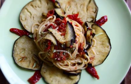 Spaghetti con melanzane e pesto di pomodori secchi