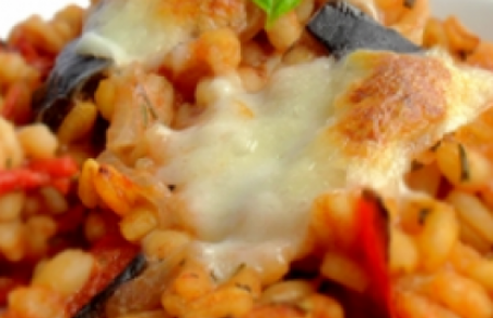 Gratin di grano Ebly con pomodori, melanzane e mozzarella