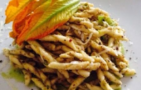 Strozzapreti al pesto di pistacchio, pecorino e fiori di zucca